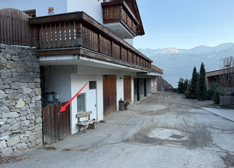 Die Abfallbehälter befinden sich hinter dem Holz-Gitter links von der Garage (siehe Bild).