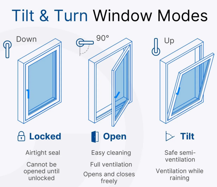 Das Fenster wird oben leicht geöffnet, sodass frische Luft hereinkommt, ohne dass es komplett offen steht.Griff nach unten (vertikal nach unten) → Fenster geschlossen